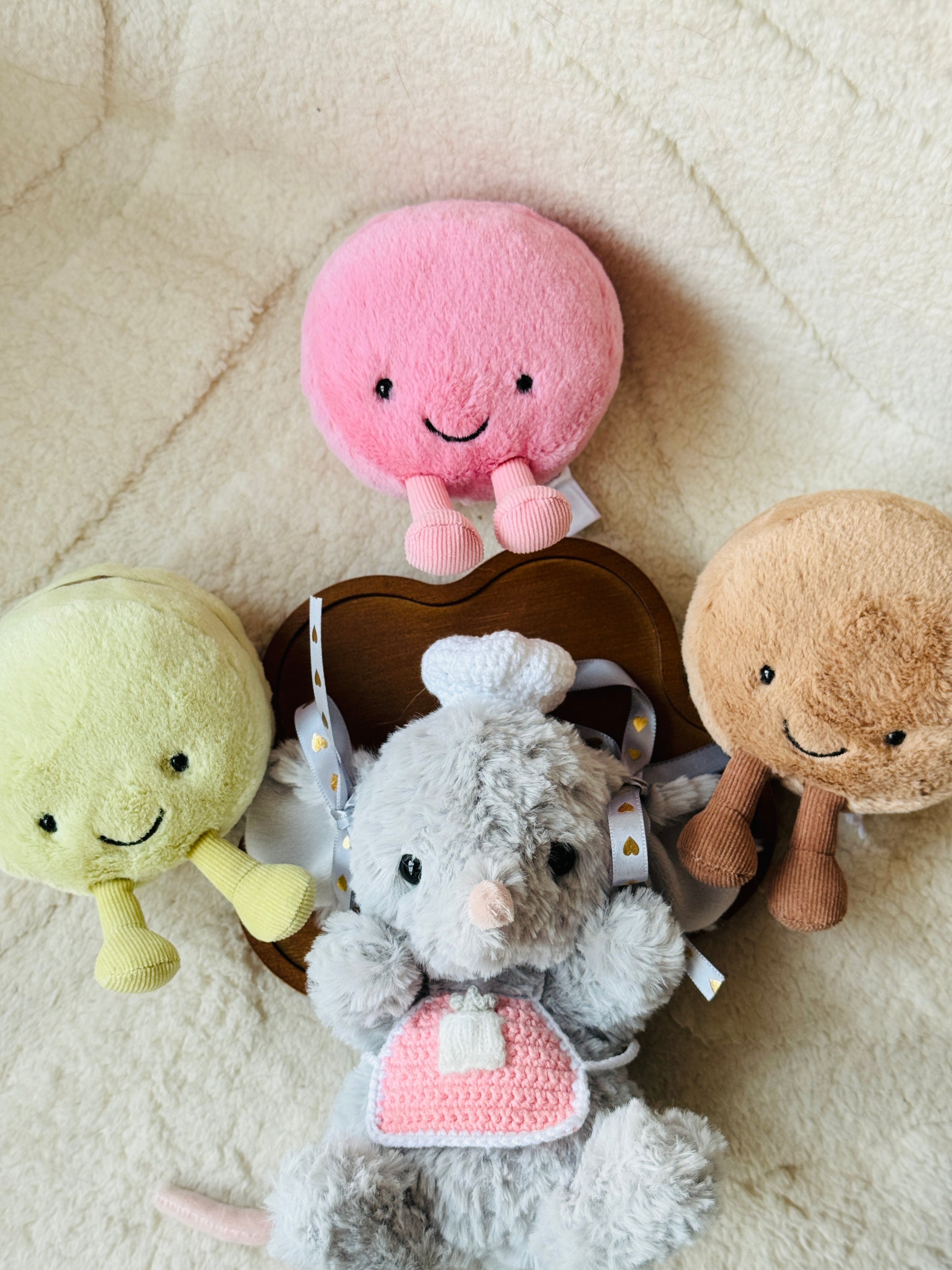 I started crocheting outfits for my Jellycats during a difficult time, and it brought me so much joy that I kept going! Every piece is carefully handmade in small batches (with occasional help from my sister), making each one unique and full of personality. This mini chef set is a tribute to everyone who’s ever dreamed of cooking up happiness—just like our favorite rat in Paris.