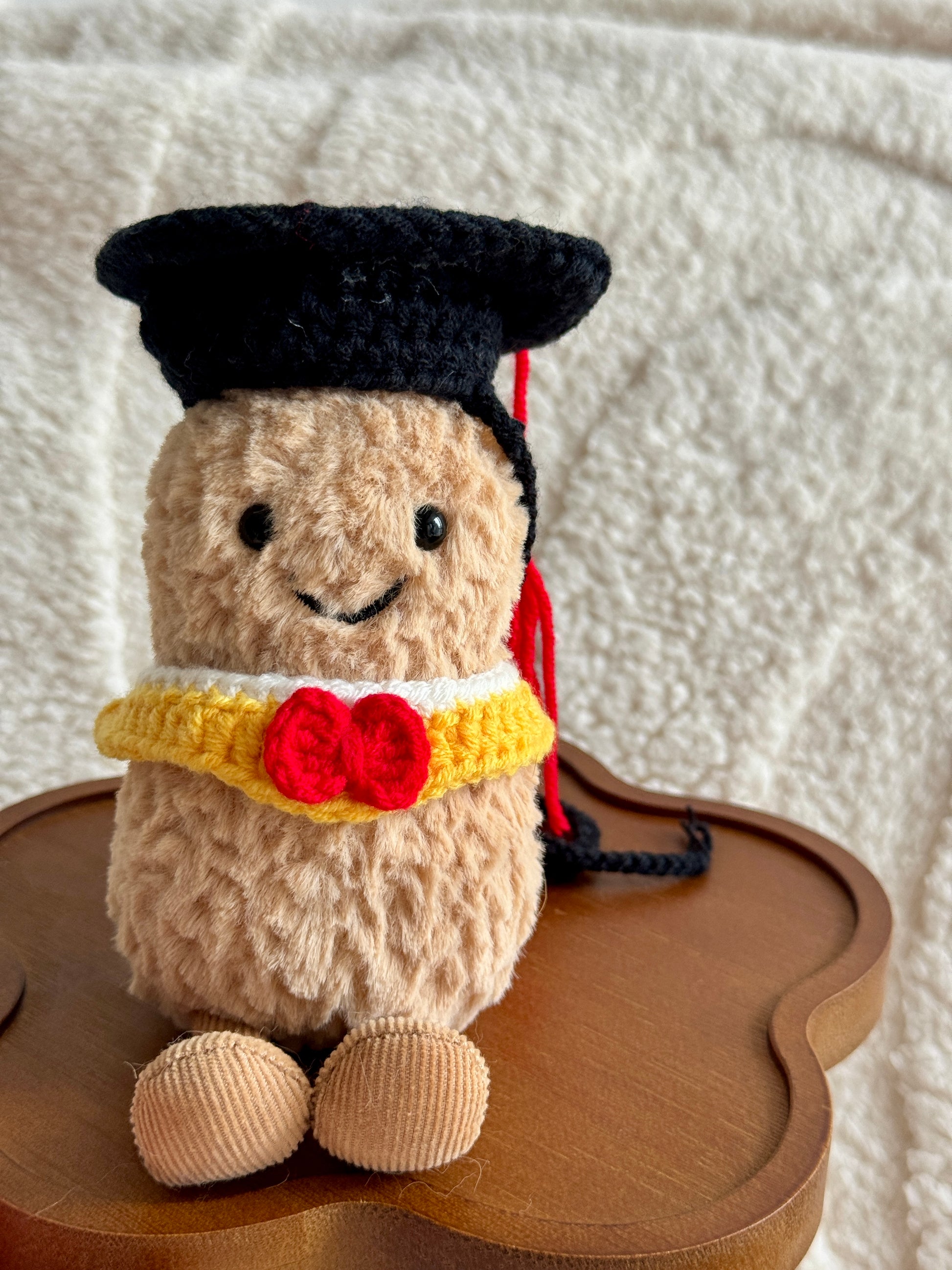 Celebrate your plushie’s big day with this adorable handmade graduation outfit set! Perfectly sized for Jellycat Amuseables and other similar plush toys, this crochet set includes a classic black graduation cap with red tassel and a yellow-and-white collar finished with a bright red bow – the ultimate mini grad look!